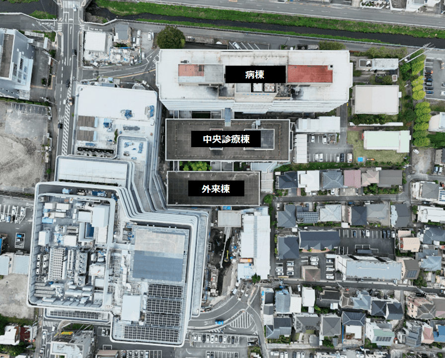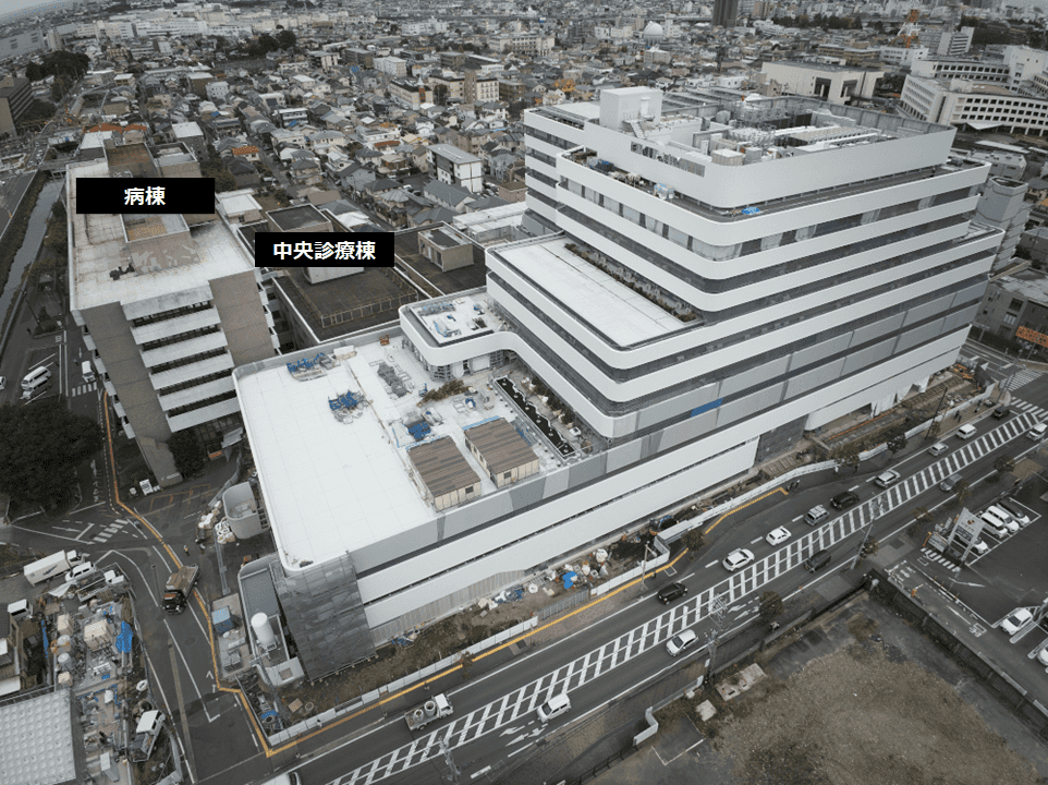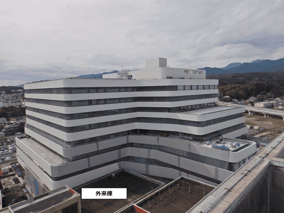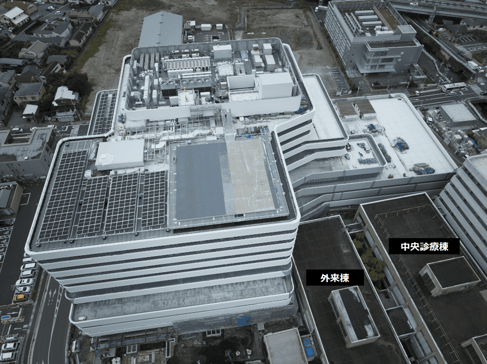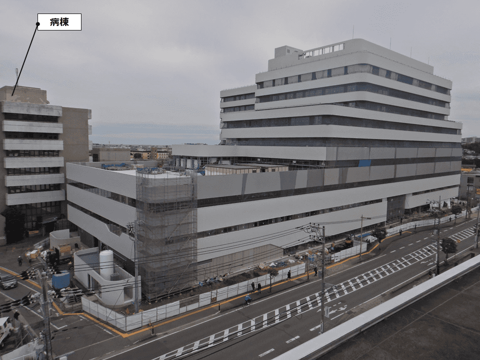 引き続き鉄骨工事、コンクリート(床スラブ打設)工事、外装工事を行っています。また、屋上では発電機の設置等の設備工事を行っています。写真の塔屋部分が新病院の最高点です。工事の進捗率は20.9%です。