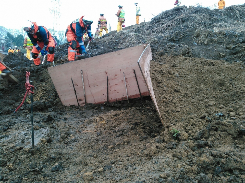 本市では土砂災害等において、要救助者の埋没地点がほぼ特定されている状況で捜索するための簡易土留めを考案しました。