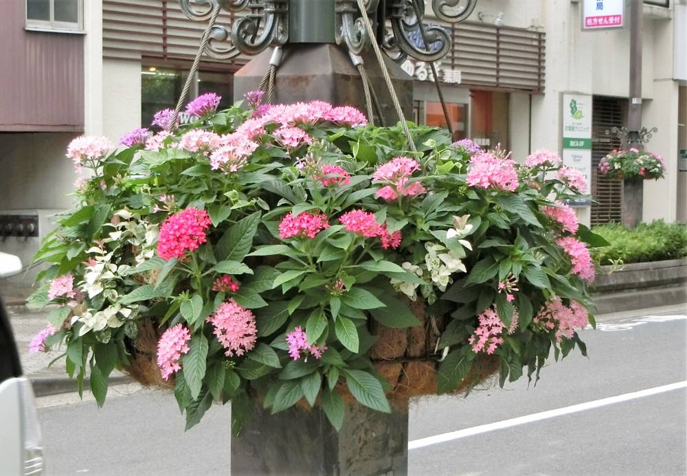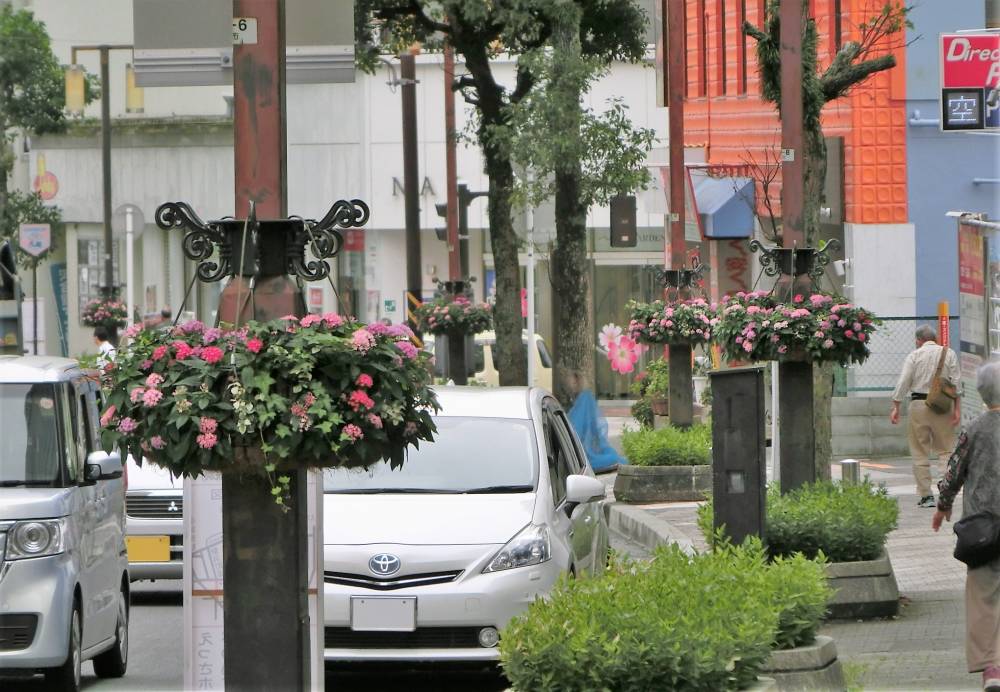 小田原市みどり公園課では、市内栄町スクランブル交差点付近の街路(幸田口通り、中央通り)の街路灯に、平成29年7月中旬から花かざりを設置しています。