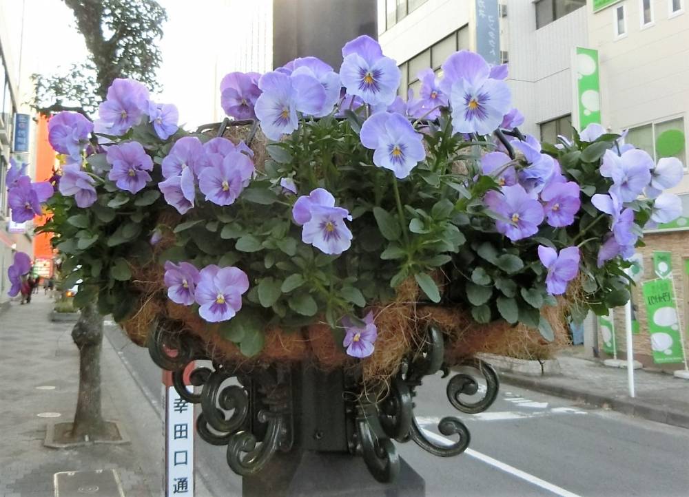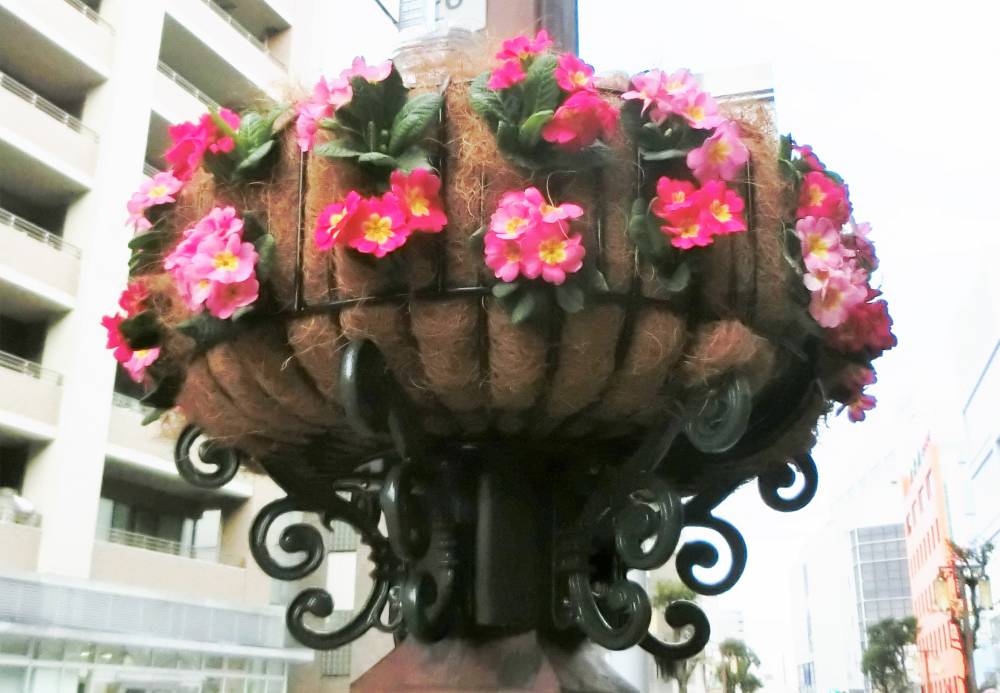 栄町スクランブル交差点付近の街路灯へ花かざりを設置しています。
