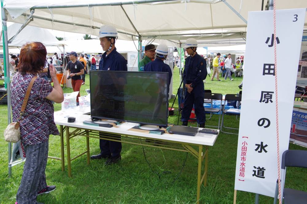 訓練には、災害時に互いに協力し合う協定を結んでいる山梨県甲府市上下水道局、災害時に応援をお願いしている第一環境株式会社の皆さん、小田原市管工事協同組合の皆さんにも参加していただきました。また、展示コーナーでは、昨年度改定した「おだわら水道ビジョン」の概要版を紹介し、水道局の耐震化の取組みをPRしました。