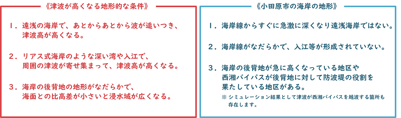 まず初めに、「津波が高くなる条件」と「小田原市の海岸の地形」から、本市に発生する津波の特徴を紹介します。