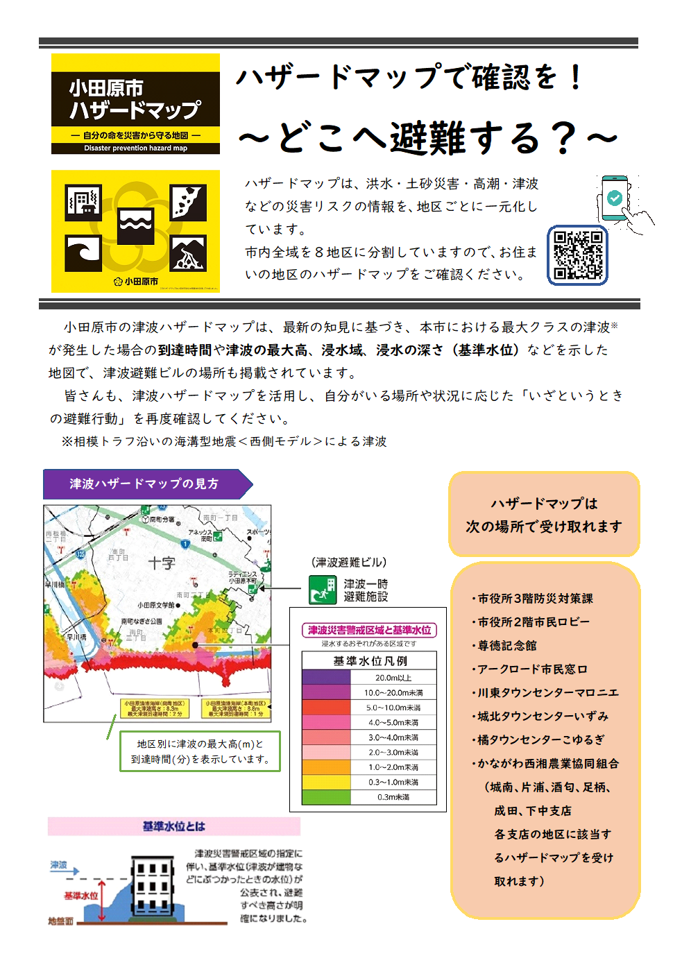 また、裏面では、津波ハザードマップの見方を紹介しています。ご自宅が津波災害警戒区域内なのか区域外なのか、ご自宅がある地区のハザードマップをご確認ください。