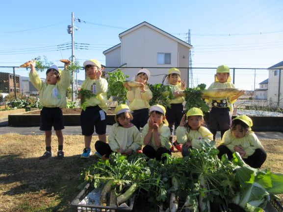 広い園庭の片隅で季節に合わせ、いろいろな野菜を育てています。種や苗を植え、水やりをしたり草を取ったりしながら野菜の生長を楽しみにしている子どもたち。収穫の日にはワクワクしながら友達と力を合わせ、野菜を収穫します。取れたての野菜は家へのお土産。保護者の皆様の協力で、持ち帰った次の日には、「カレーにしたよ。」「味噌汁にして食べたよ!」と、報告をしてくれる子どもたち。野菜を苦手としている子どももいますが、自分が育てた野菜は特別。「おいしかった!」と教えてくれると、とても嬉しくなります。