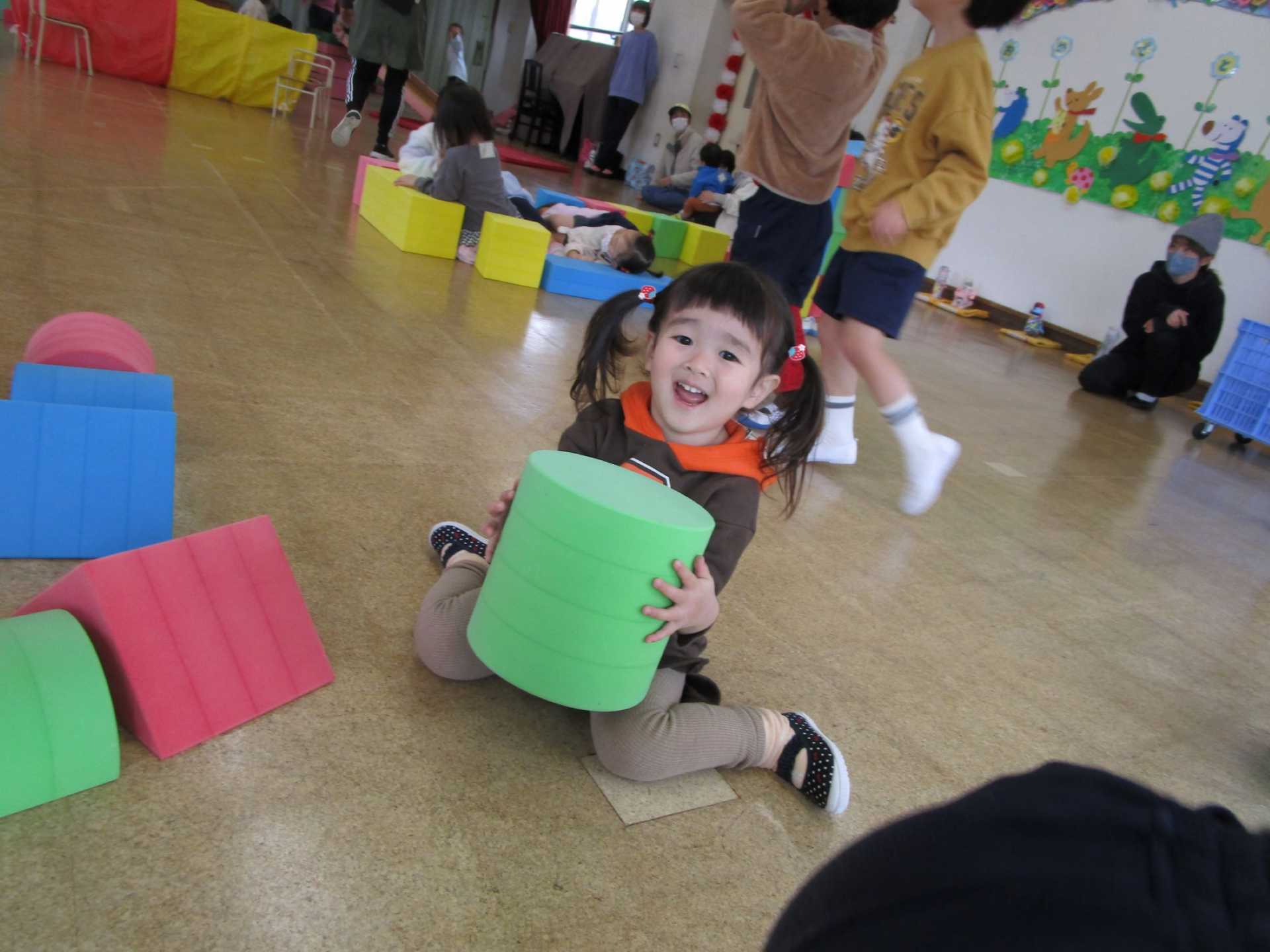 ソフトブロックを運んで並べたり、転がしたりすることを楽しみました。