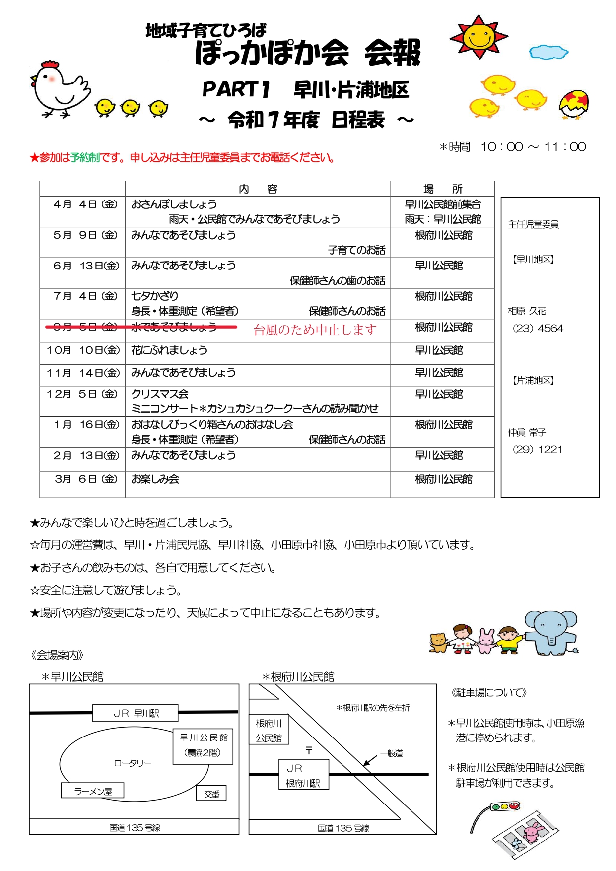 - 参加を希望される方は、必ず事前に申込みをしてください。ひろばの内容により少人数で活動する日は、早川・片浦地区にお住まいの方を優先させていただく場合もございますので、あらかじめご了承ください。