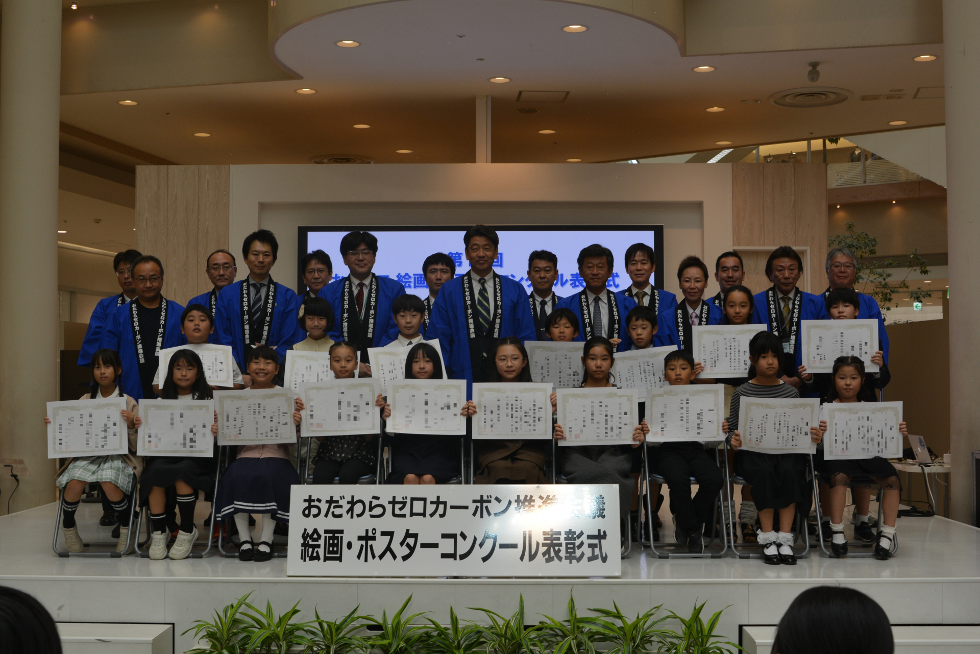 「みんなが取り組めるゼロカーボンアクション」をテーマに作品を募集した絵画・ポスターコンクールの表彰式では、受賞者の皆さんへおだゼロ会長や小田原市長、協賛企業の皆様から表彰状と副賞が送られました。