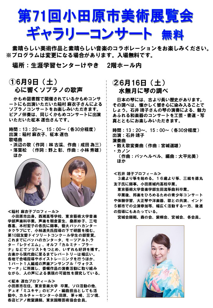 第71回小田原市美術展覧会は、平成30年6月6日から10日にかけて前期(洋画、日本画、彫塑)を、6月13日から17日にかけて後期(工芸、書道、写真)を開催しました。一般作家の作品206点と、招待作家の作品101点を合わせた計307点の力作を展示しました。また、昨年に引き続き、各期土曜日にはワークショップとギャラリーコンサートを開催しました。