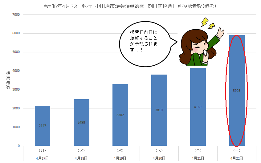 投票日当日が近づくにつれ、1日の投票者数が増加する傾向があります。特に投票日前日の土曜日は混雑することが予想されます。