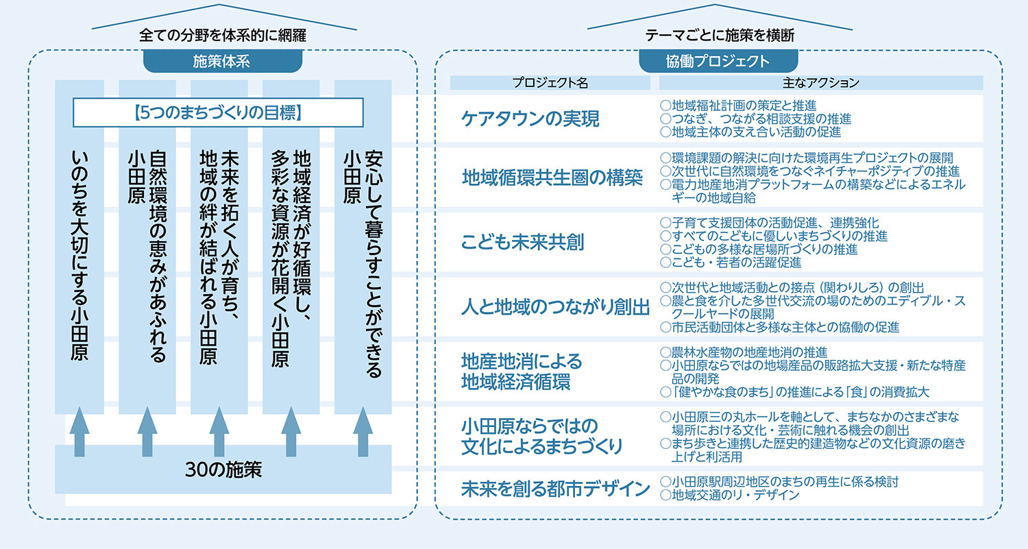 「おだわら協創プラン」では、まちづくりにおける全分野の取り組みをまとめています。これらを基本構想で定めた5つのまちづくりの目標に基づいて30の施策に整理しました。
