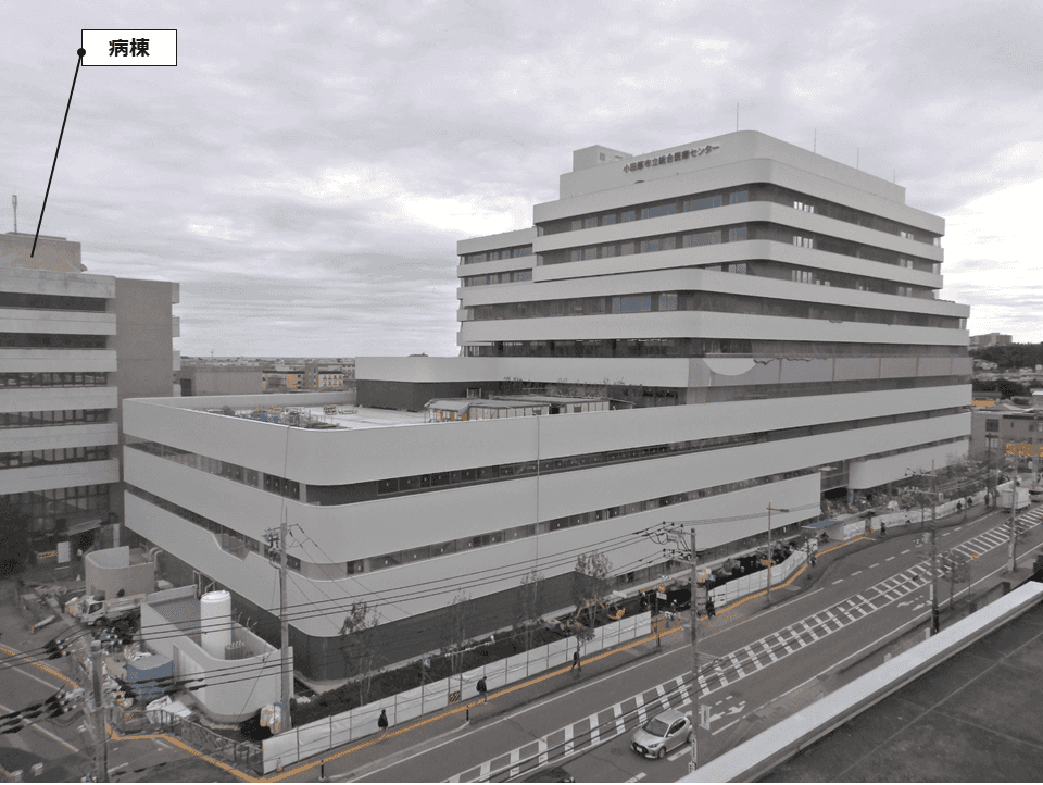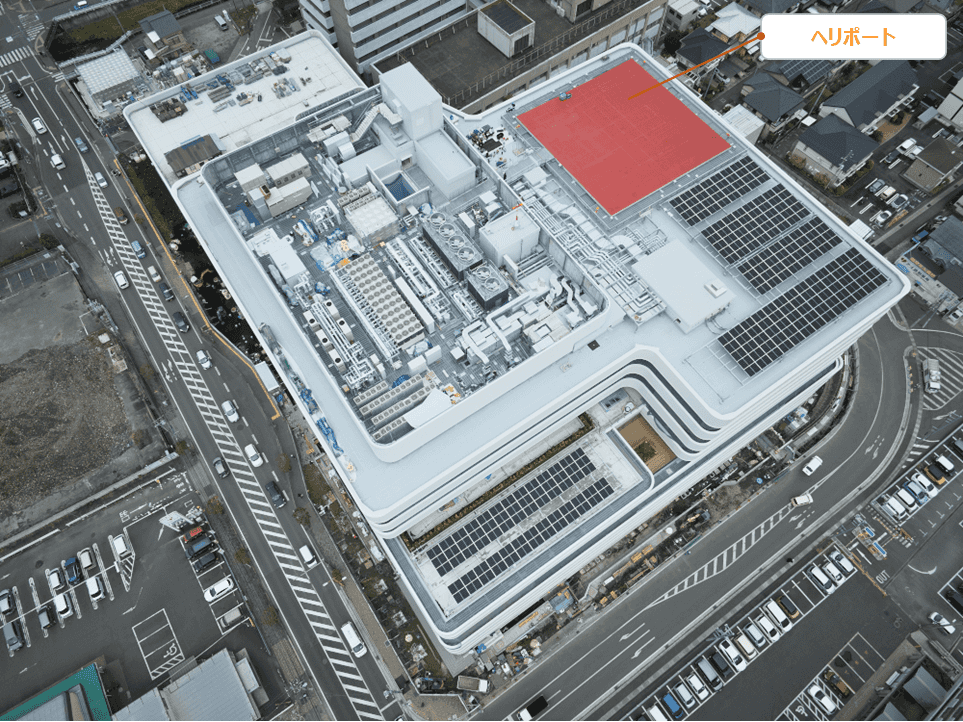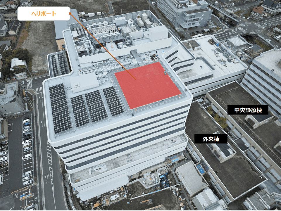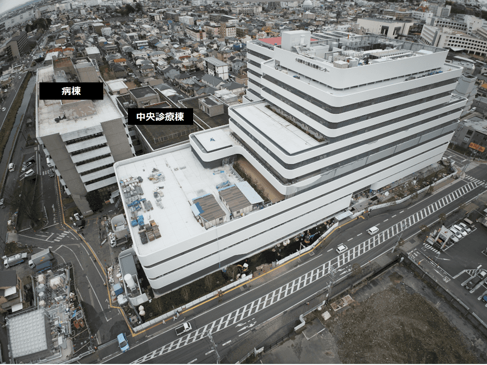 引き続き鉄骨工事、コンクリート(床スラブ打設)工事、外装工事を行っています。また、屋上では発電機の設置等の設備工事を行っています。写真の塔屋部分が新病院の最高点です。工事の進捗率は20.9%です。