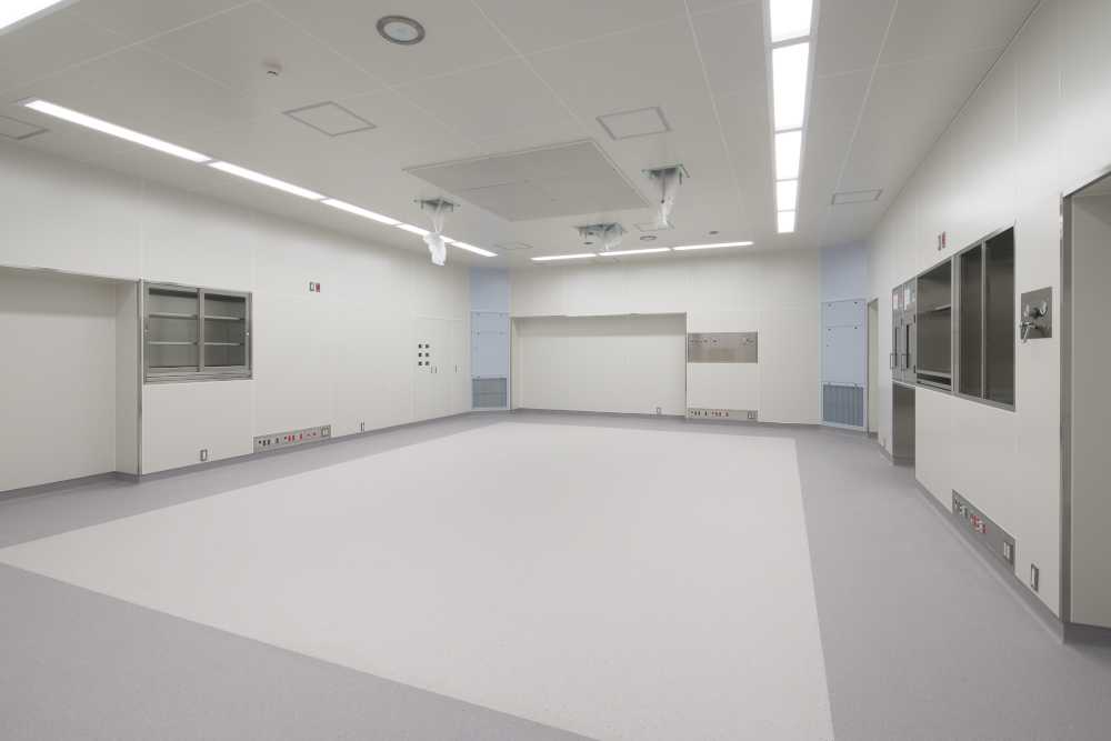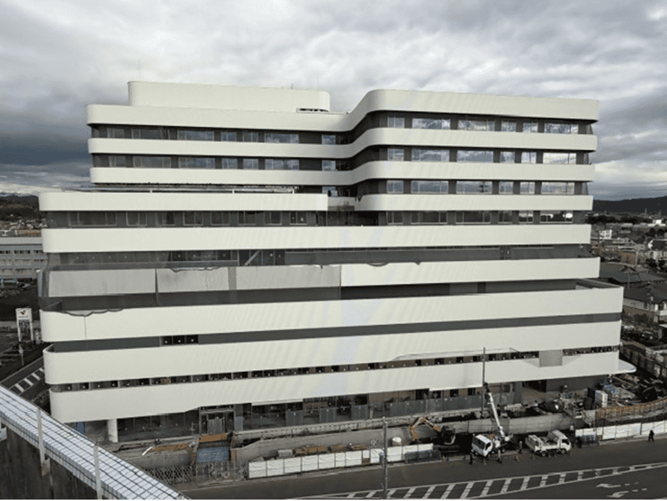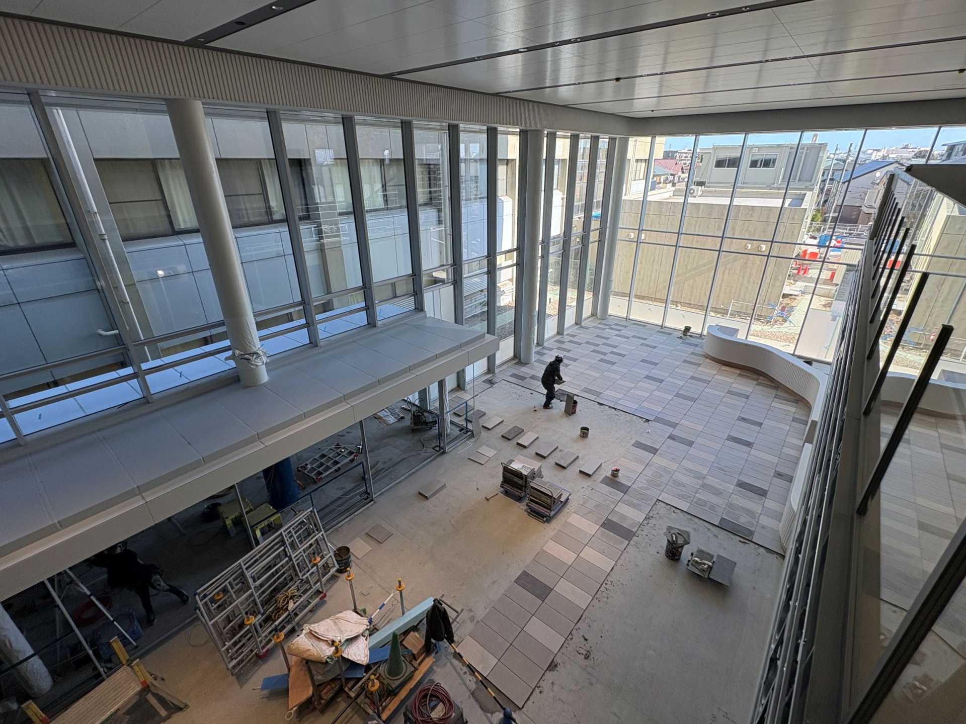 足場を外し、全体の外観が見えるようになりました。引き続き、外装工事、壁・天井の下地工事と内装ボード工事、設備(太陽光パネル100kW)工事を行っています。工事進捗率は76.0%です。