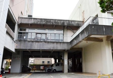 (写15)本館と大ホールを結ぶ渡り廊下その結果、建築デザインの要である大ホールの建物正面が見えなくなってしまった。更に、本館と渡り廊下で結ばれたので、開放感ある1階ホワイエは暗がりとなり、2階ロビーの明るい雰囲気も消えてしまった(写真15)。