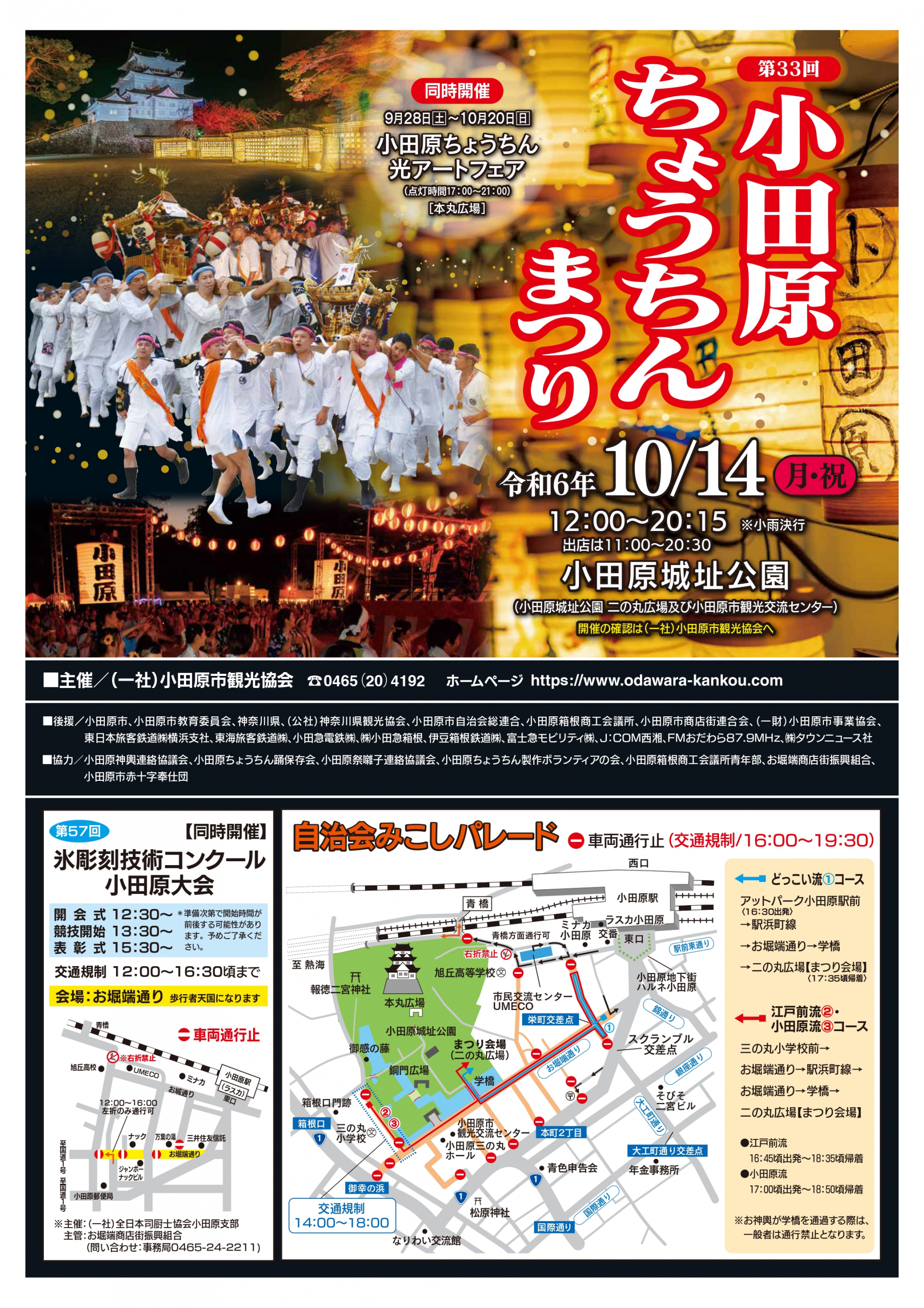 歴史に名を残した「小田原ちょうちん」をシンボルとした市民参加型の地域イベント「小田原ちょうちんまつり」を開催します。小田原城址公園二の丸広場にて「小田原ちょうちん踊り」や「風魔忍者ショー」等が行われるほか、「自治会みこしパレード」が城址公園周辺を勇壮に練り歩きます。