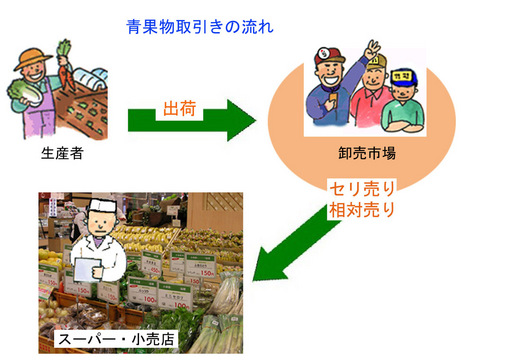 卸売市場では、卸売会社が産地の出荷者などから野菜・果物を受け取り、卸売りを行います。卸売会社は全国から集荷した青果物を、小売店が扱いやすい分量に分けて競売(せり)、または相対売によって小売店に売ります。