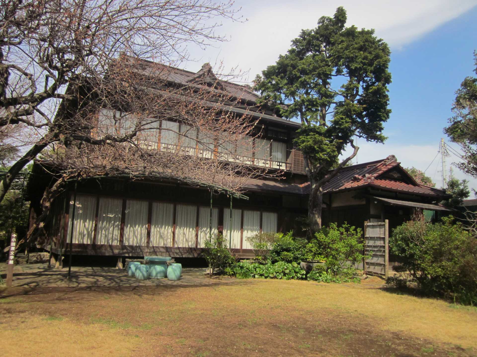 白秋童謡館の建物は、ちょうど白秋が小田原に在住していた大正13年、宮内大臣・田中光顕が北側のスペイン風洋館に先駆けて建てた別邸です。楼閣風の軽快な意匠が印象的な和風建築であり、二階屋根の南側(玄関側)と北側(建物裏側)とに設けられた千鳥破風(ちどりはふ)や銅板葺の大きな錣庇(しころびさし)が特徴的です。