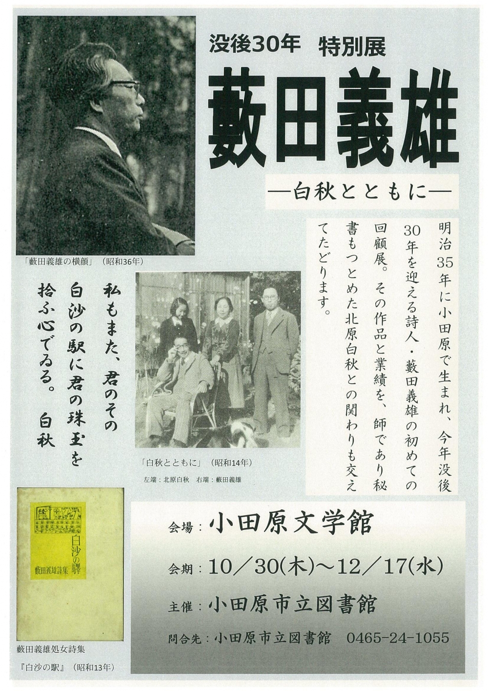 明治35年に小田原で生まれ、平成26年に没後30年を迎えた詩人・薮田義雄の初めての回顧展。その作品と業績を、師であり秘書もつとめた北原白秋との関わりも交え、3部構成、約40点の資料でたどりました。
